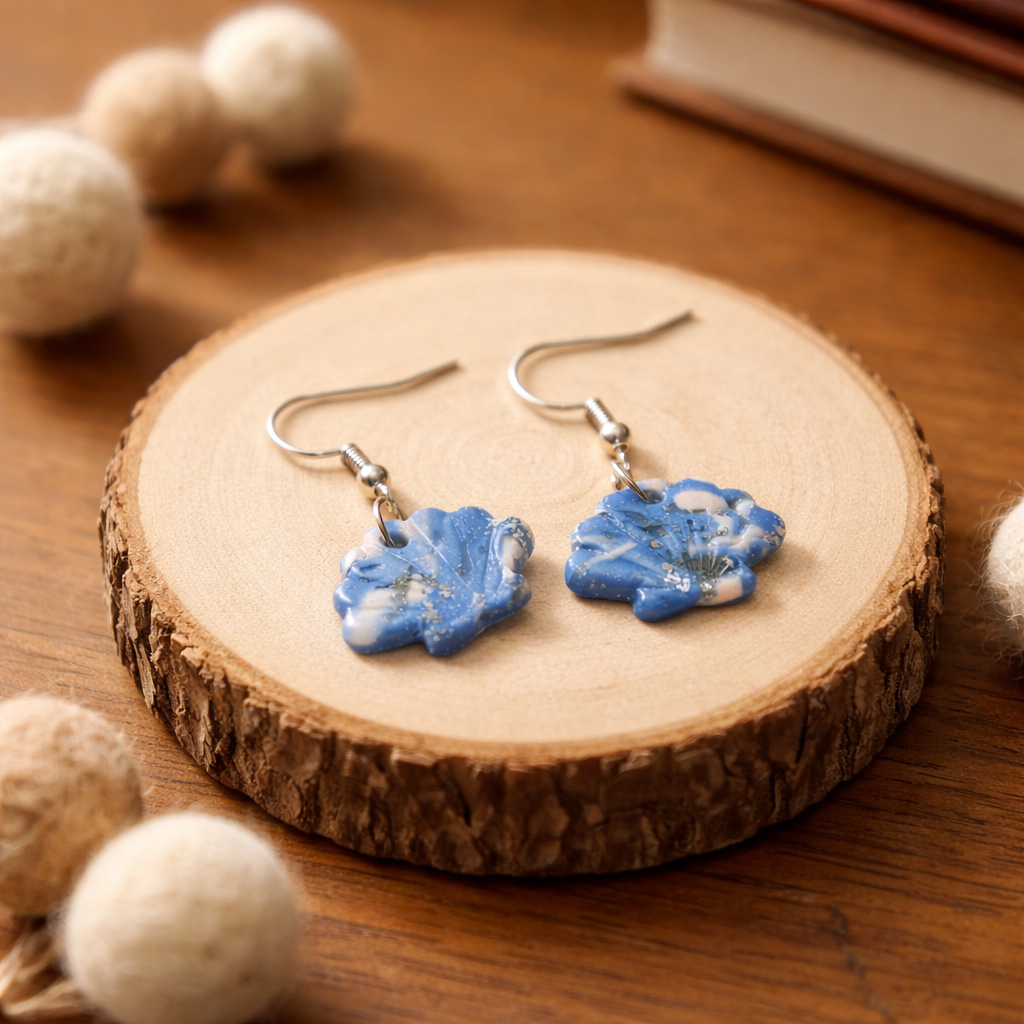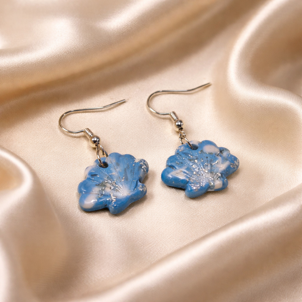 These polymer clay seashell earrings feature dreamy blue-and-white marbling with a delicate sparkle and lightweight swing. A sweet pick for beach days, summer outfits, or a thoughtful gift.