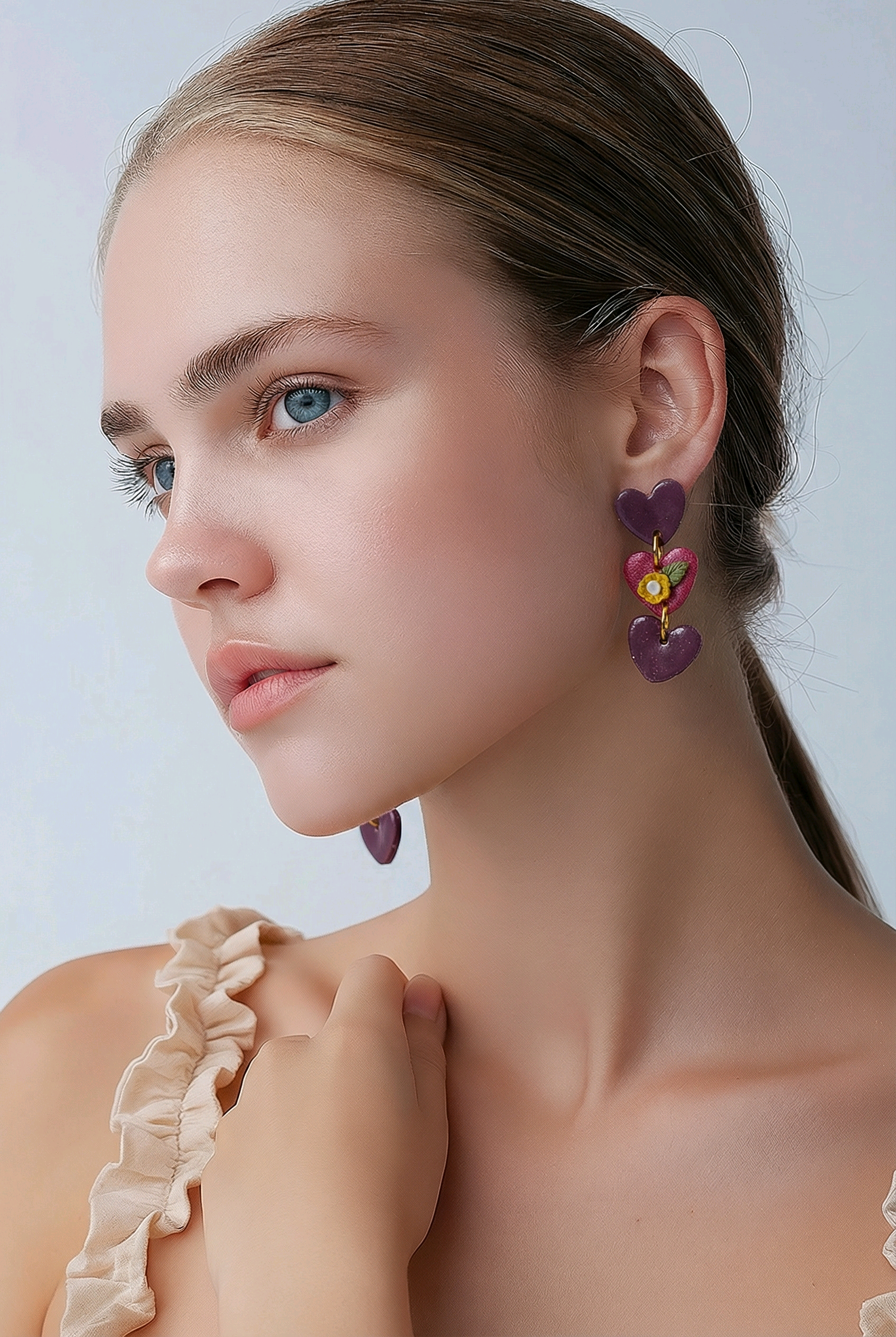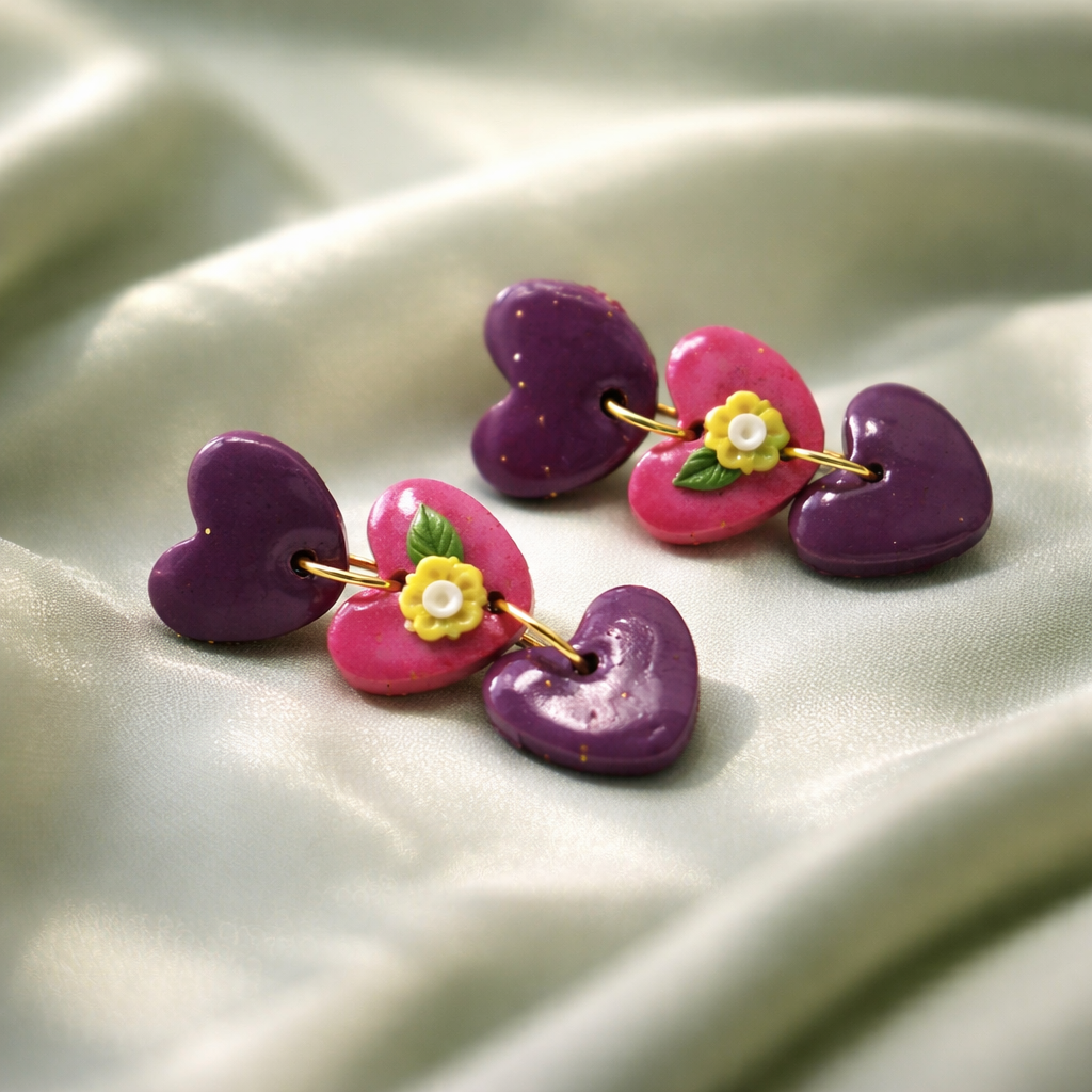 Sweet as can be, these pink and purple heart earrings bring a little joy to your day with tiny floral details and a glossy finish. Each pair is lovingly handmade, so every heart has its own one of a kind charm.