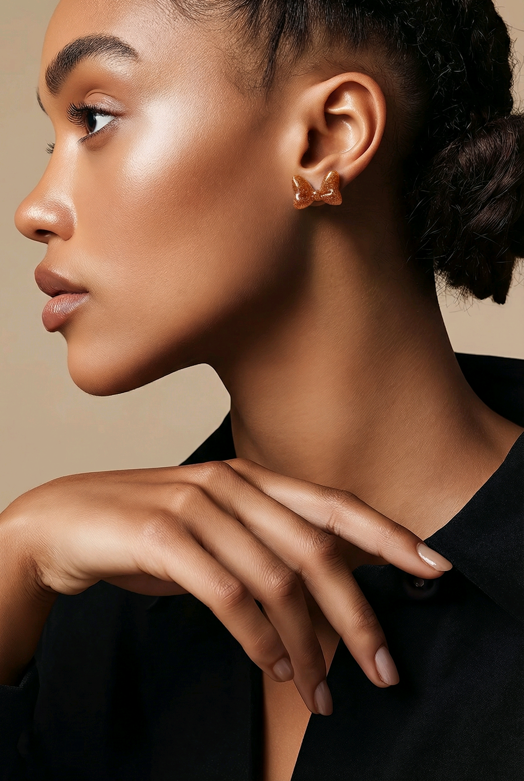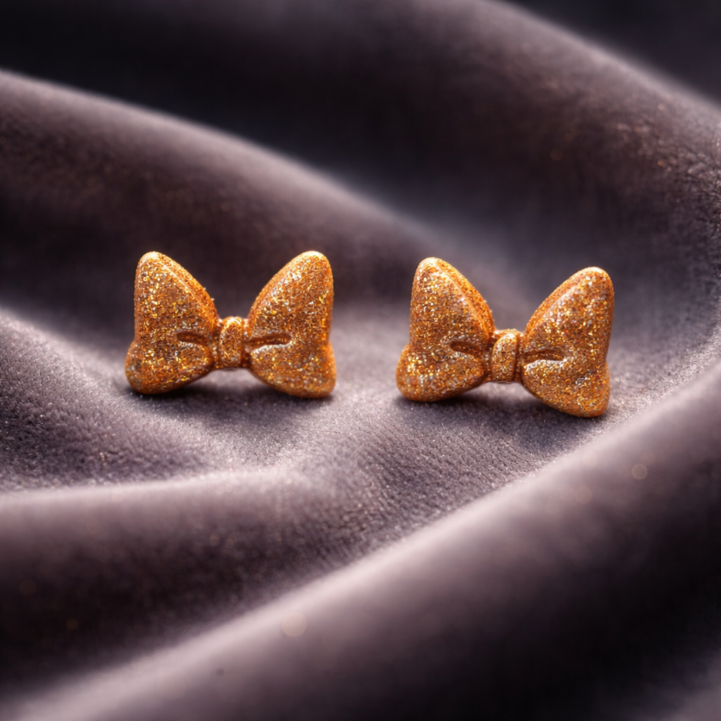 These handmade polymer clay bow earrings shimmer with a warm gold glitter finish for an easy, everyday pop. A cute, giftable pair that’s perfect for birthdays, stocking stuffers, or just because.