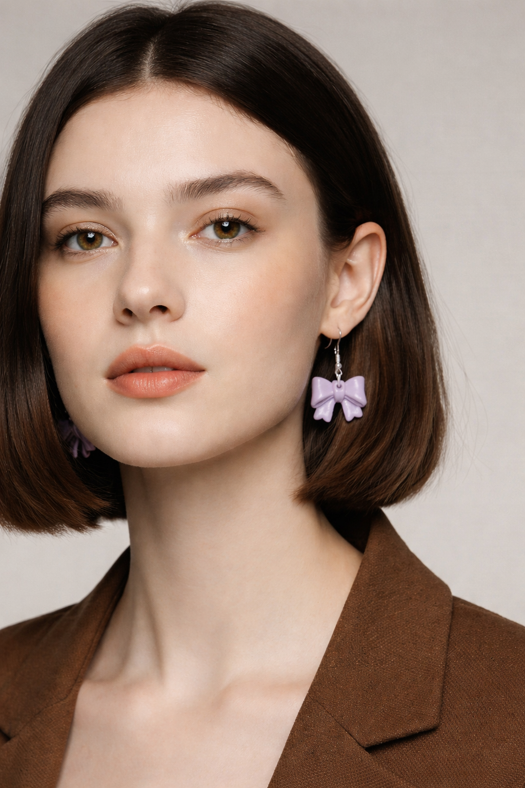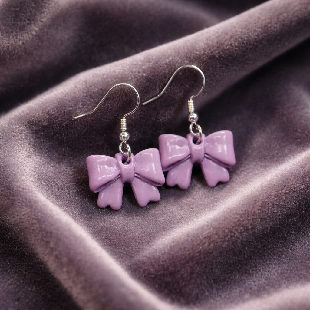 These handmade polymer clay bow earrings feature a glossy lavender finish and lightweight dangle style. A cute, giftable pair that adds a playful touch to everyday outfits and special occasions alike.