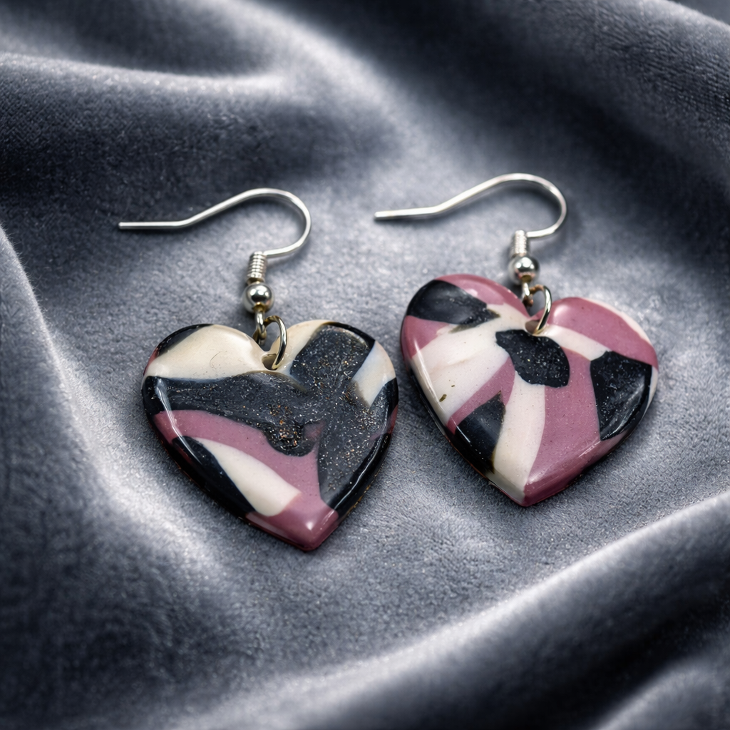 These handmade polymer clay heart earrings feature a dreamy mauve, black, and cream marbled swirl with a glossy finish. Lightweight and easy to wear, they make a lovely little gift for birthdays, Valentine’s Day, or everyday cuteness.
