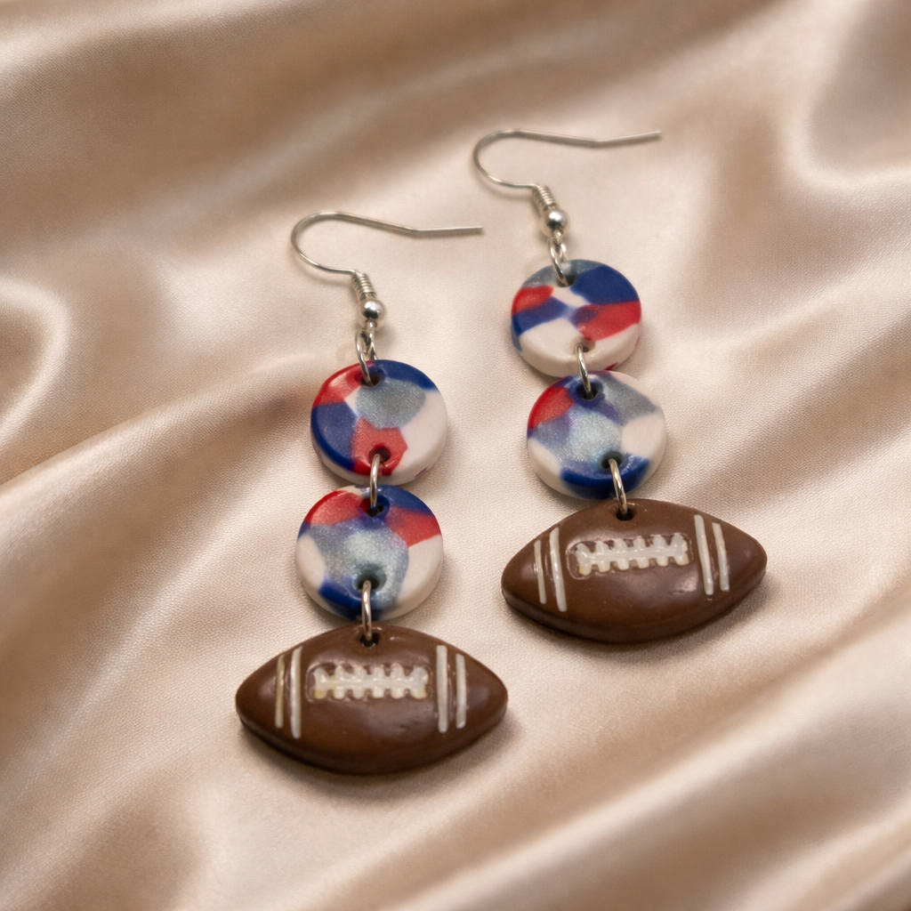 These handmade polymer clay earrings feature marbled red, white, and blue links with a little football drop for the perfect spirited look. Lightweight and easy to wear, they make a fun gift for your favorite football fan.