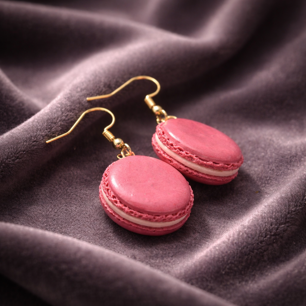 These handmade polymer clay earrings look like tiny pink macarons with a creamy filling and shiny gold-tone hooks. A fun, giftable pick for bakers, foodies, and anyone who loves cute accessories.