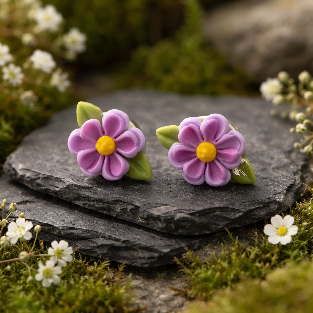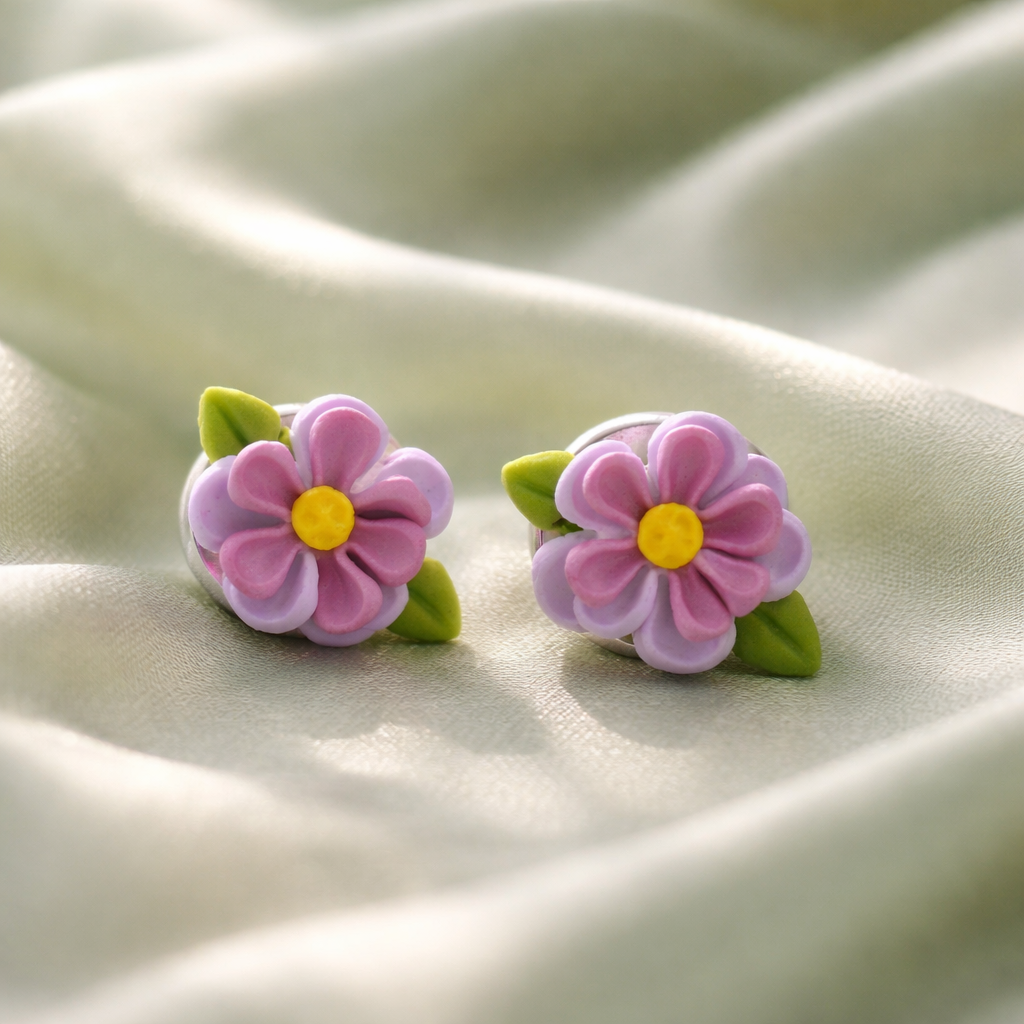 These handmade polymer clay studs feature layered purple petals, a bright yellow center, and tiny green leaves for a fresh, cheerful look. A lovely little gift for birthdays, spring outfits, or everyday wear.