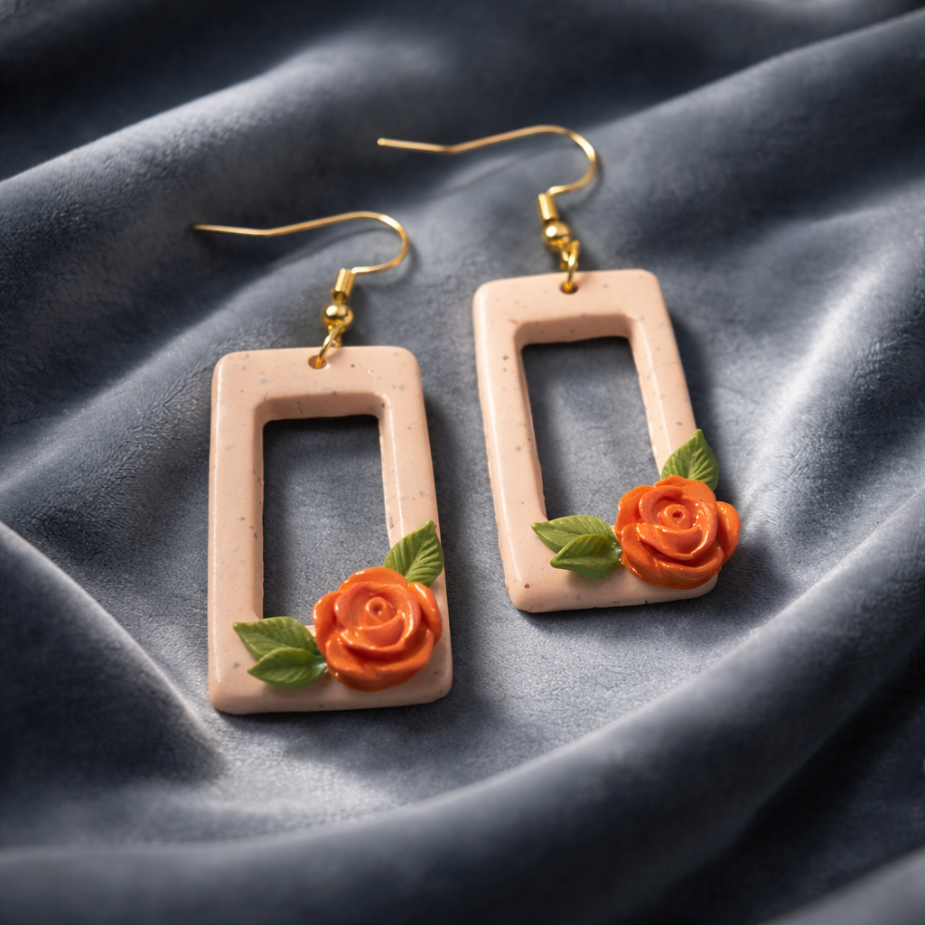 Handmade polymer clay earrings featuring a speckled blush open-rectangle frame with a tiny rose and leaf detail. Lightweight and giftable, they add a soft floral touch to date nights, brunch, or Sunday best.
