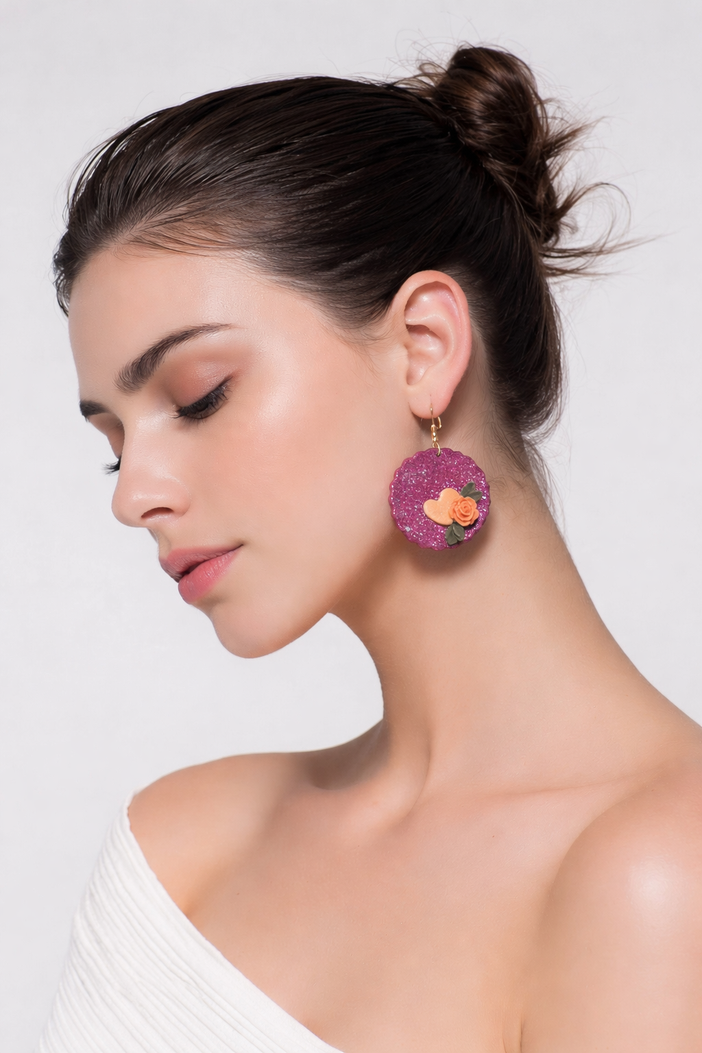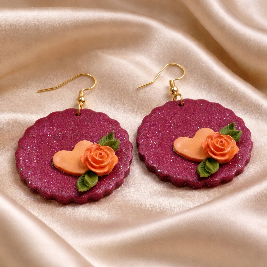 These handmade polymer clay earrings feature a scalloped glittery berry disc topped with a peach heart, a mini rose, and leafy details. A lovely little gift for date nights, weddings, or anytime you want a romantic pop of color.