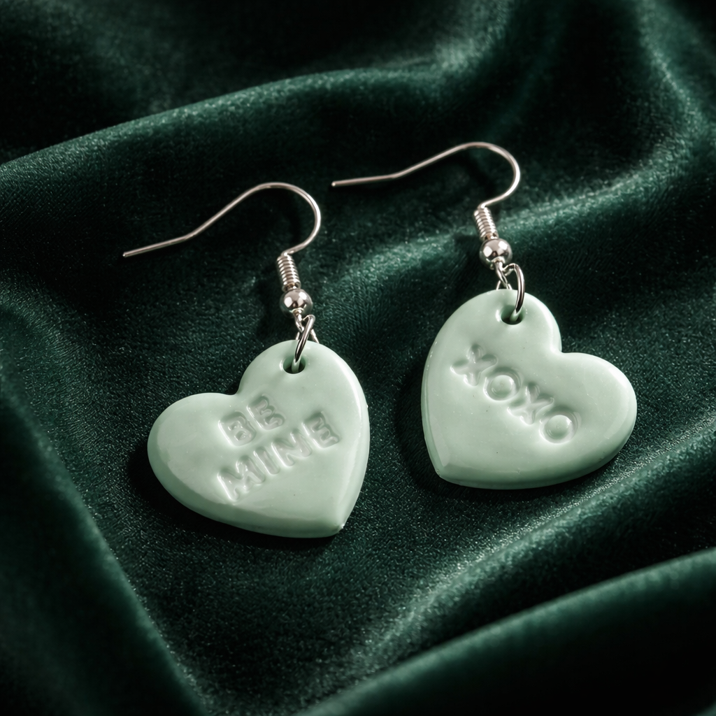 These handmade polymer clay earrings feature classic conversation-heart details in a soft sage green for a cute, flirty pop. Perfect for Valentine’s Day, date night, or gifting someone you love.