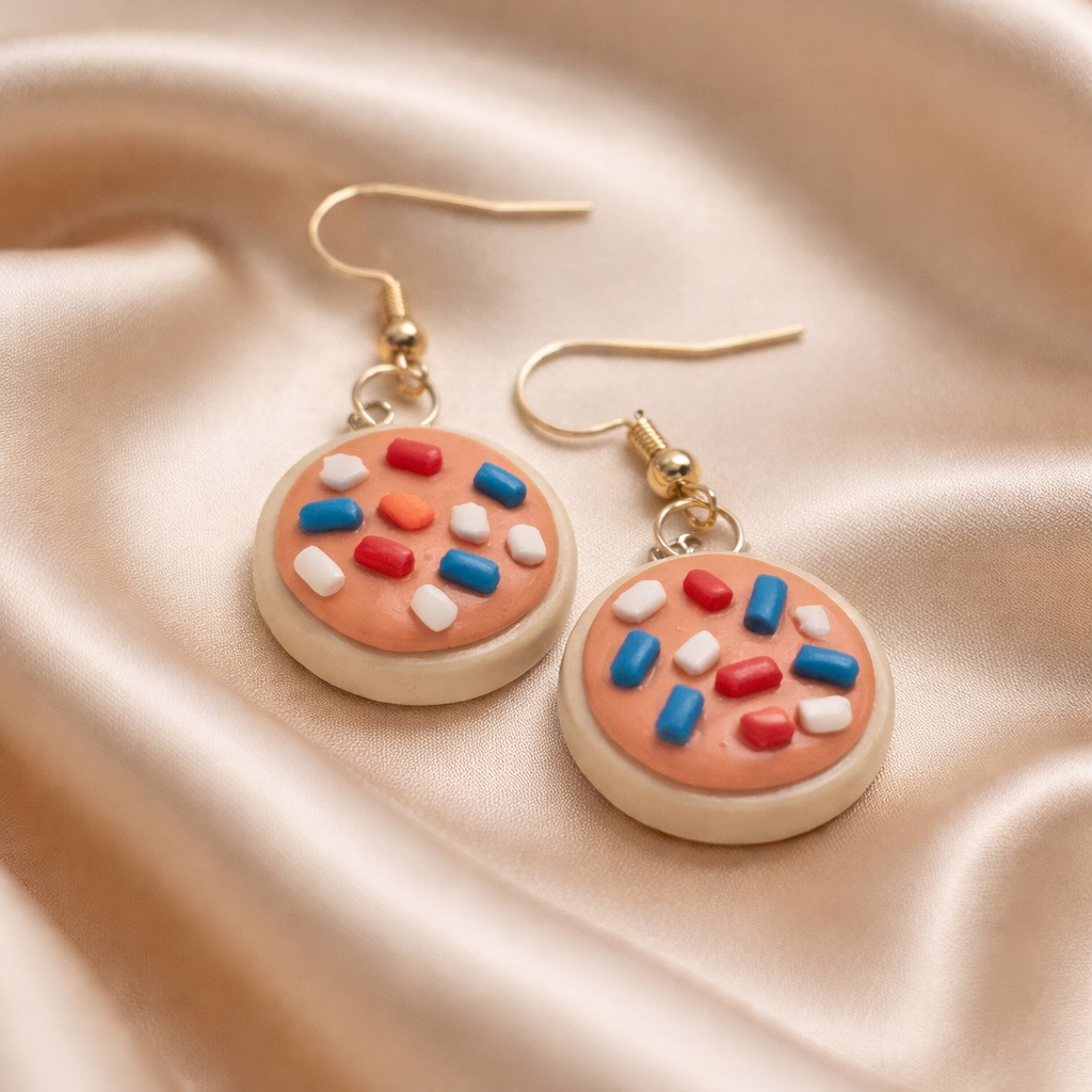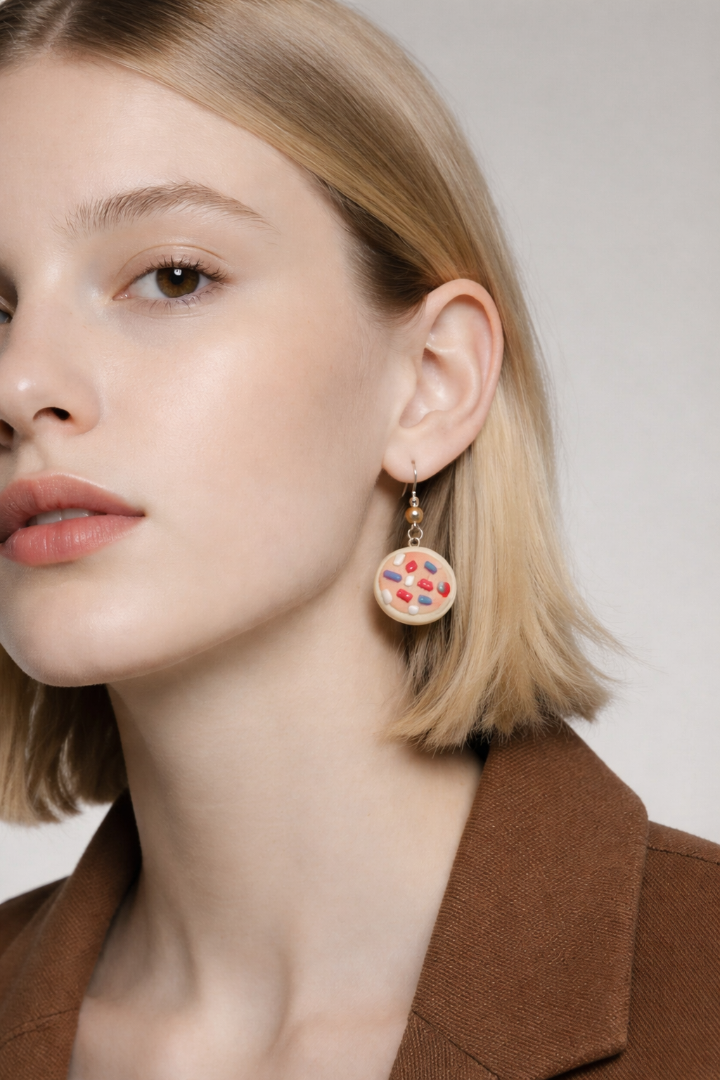 These handmade polymer clay earrings look like frosted sugar cookies with bright sprinkle details. Lightweight and giftable, they’re perfect for adding a fun dessert-inspired touch to everyday outfits.
